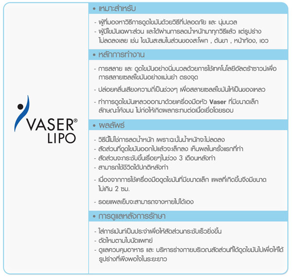 ในปัจจุบันถือได้ว่า Vaser Lipo Selection เป็นวิธีการกำจัดไขมันที่ทำให้คนไข้รู้สึกปลอดภัย และ เป็นที่นิยมมากขึ้นอย่างต่อเนื่อง เนื่องจากวิธีนี้มีหลักการทำงานผ่านการอัลตร้าซาวน์ โดยใช้คลื่นเสียงความถี่ที่เหมาะสม ทำให้สามารถสลายไขมันได้อย่างตรงจุด จากนั้นจึงดูดไขมันเหลวออกมาได้อย่างนิ่มนวล ไม่ทำลายเนื้อเยื่อรอบข้าง เส้นเลือด หรือ เส้นประสาท พบโอกาสในการบวม ช้ำ น้อย ไม่มีการกระแทกหัวเครื่องมือรุนแรงเหมือนการดูดไขมันแบบเก่า (Liposunction)