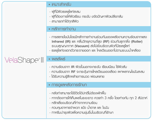 Velashape III เทคโนโลยีที่ผสมผสานการทำงานของ คลื่นวิทยุ (RF) , พลังงานแสง Infared (IR) ร่วมกับลูกกลิ้ง (Roller) ระบบสุญญากาศ (Vacuum) ที่มีประสิทธิภาพแห่งการสลายเซลล์ไขมันออกมาในรูปแบบของการนวดควบคู่ไปกับการ ปล่อยพลังงานคลื่นวิทยุ (RF) จะช่วยเข้าไปกระตุ้นการทำงานของคอลลาเจนชั้นลึก โดยที่ พลังงานแสง (IR) จะช่วยให้คอลลาเจนชั้นตื้นกระชับขึ้น ร่วมกับการนวดด้วยลูกกลิ้งที่จะช่วยให้พลังงานเหล่านี้กระจายตัวเข้าไปสลายไขมันได้อย่างมีประสิทธิภาพมากยิ่งขึ้น โดยที่ไม่เจ็บตัว สบายตัว ได้รับความรู้สึกคล้ายการนวดผิว