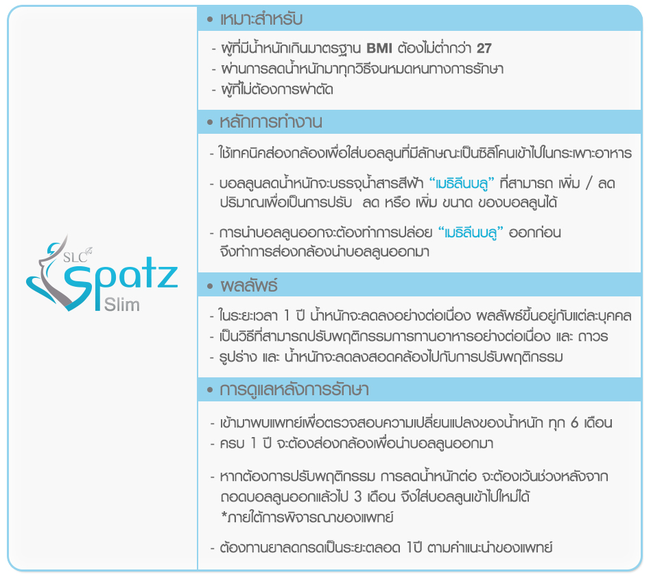 Spatz Slim เทคโนโลยีแห่งการลดน้ำหนักด้วยการส่องกล้องใส่บอลลูนเข้าไปในกระเพาะอาหารเพื่อปรับพฤติกรรมการลดน้ำหนักได้อย่างต่อเนื่องในระยะเวลา 1 ปี สามารถปรับขนาดของบอลลูนได้โดยการ เพิ่ม / ลด การใส่น้ำสารสีฟ้า “เมธิลีนบลู” ได้ตามความเหมาะสมกับร่างกายของคนไข้ โดยจะต้องได้รับการพิจารณาจากแพทย์ผู้เชี่ยวชาญเฉพาะทาง เหมาะสมกับผู้ที่มีน้ำหนักเกินมาตรฐาน BMI (ค่าดัชนีมวลกาย) มากกว่า 27 โดยสามารถตรวจสอบความสมดุลดัชนีมวลกายได้ใน Link : goo.gl/4o2B6K รวมถึงเหมาะสำหรับ ผู้ที่ได้เคยผ่านการลดน้ำหนักมาหลายวิธี ทั้งการทานยาลดน้ำหนัก(แบบกดประสาท) , การออกกำลังกายอย่างหักโหม หรือแม้กระทั่งการอดอาหาร แต่ก็ยังไม่ได้ผล วิธีนี้จึงเป็นอีกหนึ่งเทคโนโลยีทางการแพทย์ที่จะช่วยปรับรูปร่างตั้งแต่พฤติกรรมการทานเพื่อลดน้ำหนักได้ในระยะยาว
