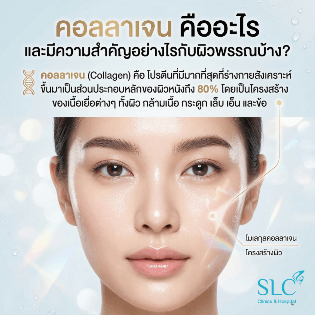 คอลลาเจน (Collagen) คือ โปรตีนที่มีมากที่สุดที่ร่างกายสังเคราะห์ขึ้นมาเป็นส่วนประกอบหลักของผิวหนังถึง 80% โดยเป็นโครงสร้างของเนื้อเยื่อต่างๆ ทั้งผิว กล้ามเนื้อ กระดูก เล็บ เอ็น และข้อ ซึ่งคอลลาเจนในผิวจะอยู่ที่ชั้นหนังแท้ มีส่วนช่วยให้ผิวหนาแน่นแข็งแรง มีความยืดหยุ่นกระชับไม่หย่อนคล้อย ภายในร่างกายพบคอลลาเจนอยู่ 16 ชนิด แต่ชนิดที่เด่นที่สุดมี 5 ประเภท ได้แก่