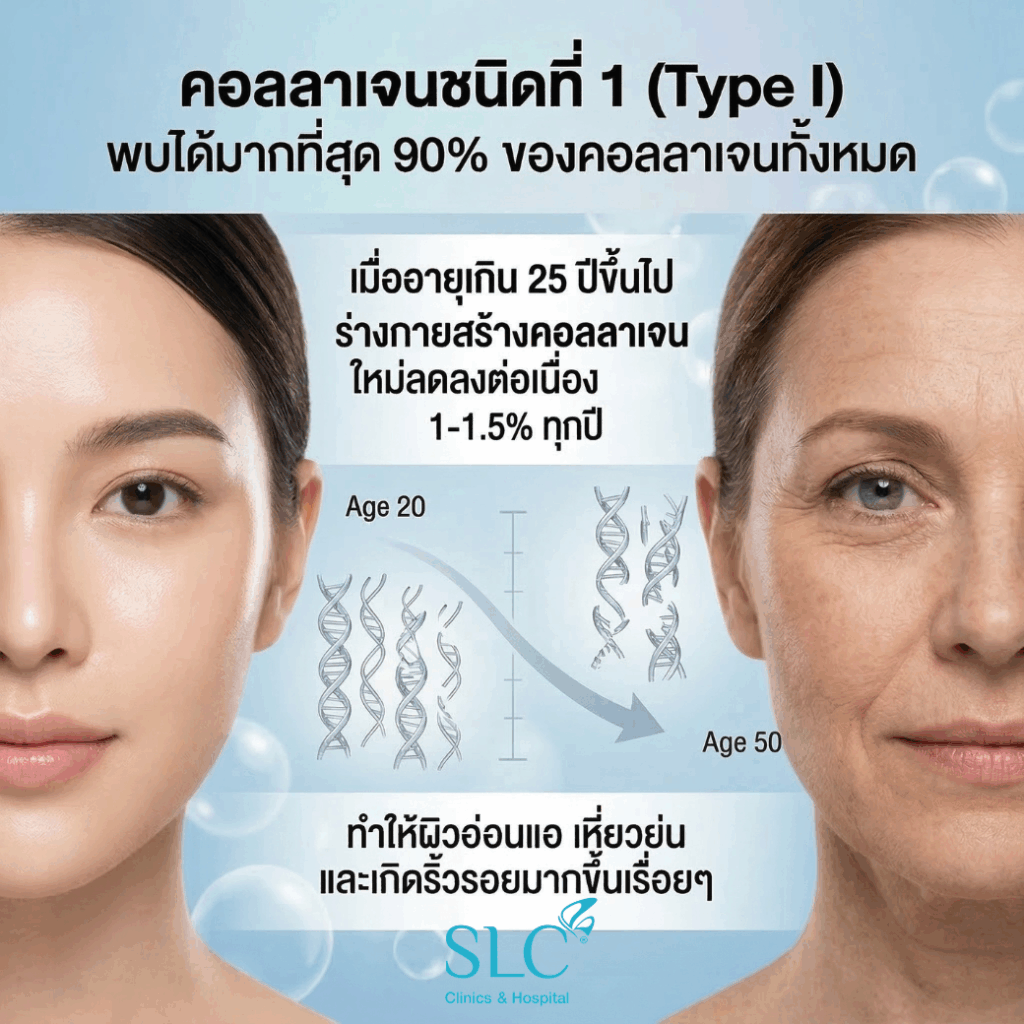 โดยคอลลาเจนชนิดที่ 1 มีความสำคัญต่อผิวมากที่สุด เพราะมีส่วนช่วยเสริมสร้างผิวให้แข็งแรง กระชับ ดังนั้นการกระตุ้นคอลลาเจน ไม่ว่าจะกิน ทา หรือฉีด จึงมุ่งเน้นไปที่บริเวณคอลลาเจนชนิดที่ 1 เพื่อช่วยย้อนวัยผิวให้ดูกระชับ ไร้ริ้วรอย และโดยปกติร่างกายจะสร้างและสลายคอลลาเจนได้สมดุล แต่เมื่ออายุเกิน 25 ปีขึ้นไป ร่างกายสร้างคอลลาเจนใหม่ลดลงต่อเนื่อง 1-1.5% ทุกปี ทำให้ผิวอ่อนแอ เหี่ยวย่น และเกิดริ้วรอยมากขึ้นเรื่อยๆ