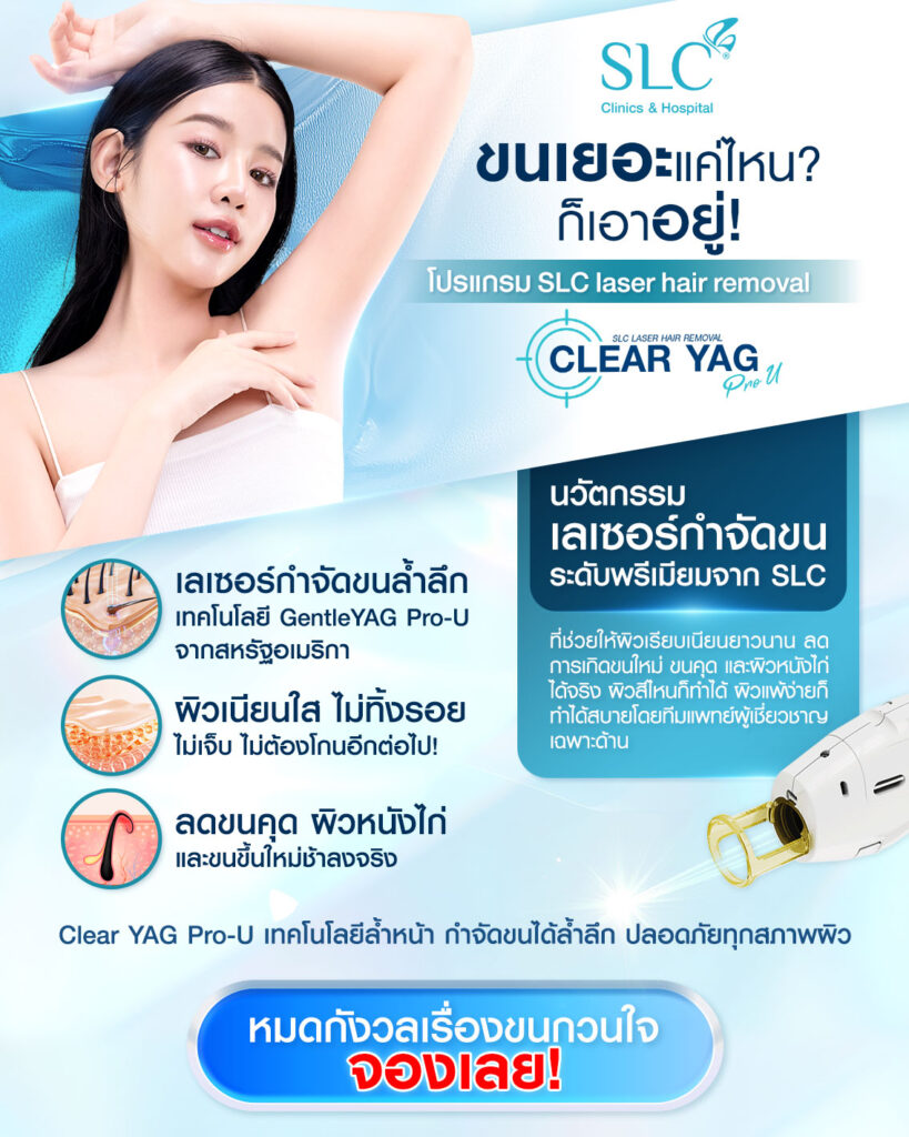 พอแล้วกับปัญหาขนดก ดำ คัน ขนคุด แถมต้องเจ็บตัวซ้ำซาก และปัญหาผิวกวนใจจากการกำจัดขนแบบเดิม ๆ! การลงทุนกับ โปรแกรม เลเซอร์กำจัดขน SLC Laser Hair Removal คือการมอบของขวัญที่ดีที่สุดให้ผิวของคุณ เป็นการแก้ปัญหาที่ต้นเหตุเพื่อผลลัพธ์ผิว เนียนนานไม่เป็นตอ ที่ไม่ใช่แค่เรื่องของความสวยงาม แต่คือความมั่นใจที่เพิ่มขึ้นได้ทุกวัน ถึงเวลาทิ้งมีดโกนกับแหนบ แล้วมาจบที่ SLC Clinic ที่ซึ่งมีทีมแพทย์และเทคโนโลยีคุณภาพระดับพรีเมียมรอคุณอยู่ สามารถเข้ามาปรึกษาแพทย์เพื่อประเมินความเหมาะสมก่อนทำได้เลย! แล้วเตรียมพร้อมโชว์ผิวเนียนใสไร้ขนกวนใจในเวอร์ชันที่เหมาะกับคุณ!