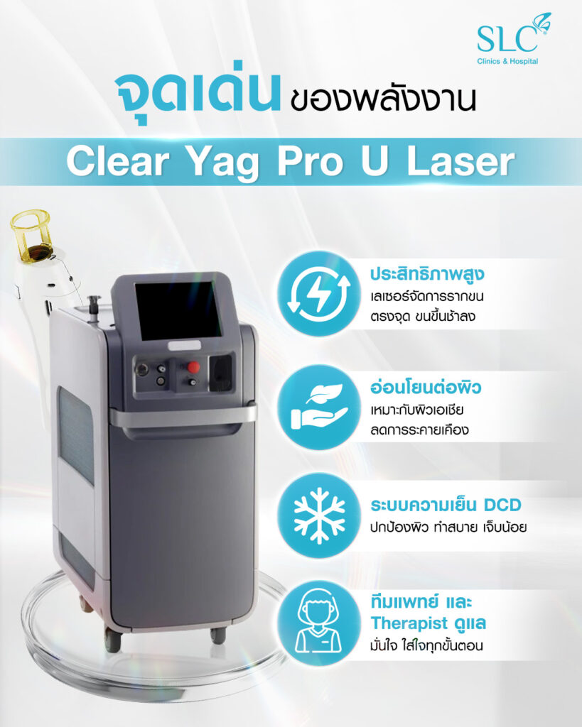 ที่ SLC Clinic เราไม่ได้แค่กำจัดขน แต่เราอัปเกรดประสบการณ์ผิวเนียนของคุณไปอีกระดับด้วยเทคโนโลยี Clear Yag Pro-U (GentleYAG Pro-U) ซึ่งเป็นเครื่องเลเซอร์กำจัดขนระดับพรีเมียม มาตรฐาน Gold Standard ที่ตัวแม่ในวงการบิวตี้เลือกใช้!
