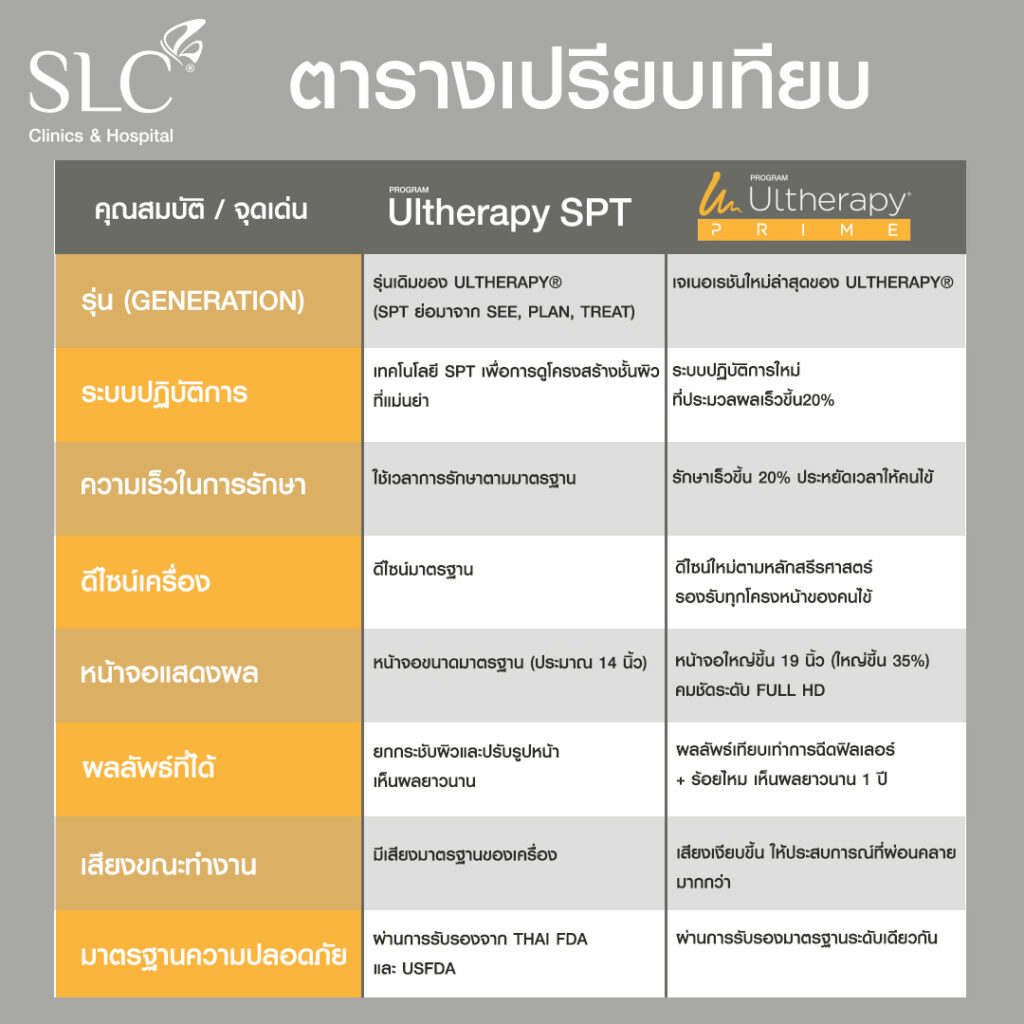 อ่านถึงตรงนี้แล้วพอจะไขข้อข้องใจได้ไหมคะ ? สรุปแล้วว่า Ultherapy SPT Program ก็ยังเป็นเครื่องยกกระชับที่ยังมีคนใช้มากที่สุด แต่เมื่อยุคสมัยเปลี่ยนไป การพัฒนาย่อมดียิ่งขึ้น เลยมีการอัปเกรดเครื่องเป็นเวอร์ชันล่าสุด Ultherapy Prime Program เท่านั้นเองค่ะ ตอบโจทย์สำหรับคนที่กลัวเจ็บ และคนที่อยากเห็นผลลัพธ์ไวยิ่งขึ้น เครื่องใช้งานได้ง่ายมากขึ้น โปรแกรมนี้ก็เลยยังเป็นที่รู้จักและนิยมมาก ๆ ในอันดับต้น ๆ ของไทย เพราะไม่ว่าจะคลินิกไหนก็มีโปรแกรมนี้!