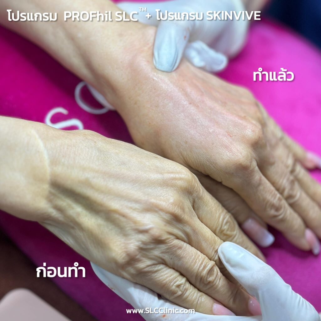 คุณมูนาเล่าว่าการดูแลผิวมือด้วย ProfhilSLC™ Program ช่วยให้มือนุ่มชุ่มชื้นขึ้นมาก ที่สำคัญคือ แลดูเป็นธรรมชาติ ซึ่งงานนี้คุณหมอดา พญ.พิมพิดา วรัญญูรัตนะ (ว.26703) ก็ยืนยันอีกเสียงว่า โปรแกรมนี้แตกต่างจากการใช้โปรแกรมฟิลเลอร์แบบเดิมๆ ที่บางครั้งอาจทำให้ดูบวม หรือไม่เป็นธรรมชาติ แต่ ProfhilSLC™ Program ให้ผลลัพธ์เรื่องความชุ่มชื้นและฟื้นฟูผิวจากภายในอย่างแท้จริง