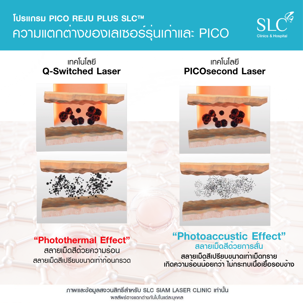 ความพิเศษของ โปรแกรม Pico Reju Plus SLC™ อยู่ตรงที่ใช้หลักการทำงานแบบ Photoacoustic Effect หรือการส่งพลังงานด้วยคลื่นกระแทก เปรียบเหมือนการใช้แรงเคาะให้เม็ดสีแตกกระจายเป็นอนุภาคขนาดเล็กมาก ๆ จนร่างกายขับออกได้ง่าย แทนที่จะใช้ความร้อนเผาทำลาย (Photothermal Effect) แบบเทคโนโลยีรุ่นเก่าอย่าง Q-Switched Laser วิธีนี้จึงไม่ทำให้ผิวชั้นนอกได้รับความเสียหาย ไม่เกิดการสะสมความร้อนใต้ผิว และที่สำคัญ ไม่ทำให้ผิวบางลง