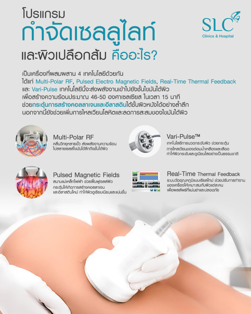 หนึ่งในเทคโนโลยีที่ได้รับความนิยมในคลินิกชั้นนำคือ Venus SLC™ Program เป็นเครื่องมือเทคโนโลยีคลื่นความถี่วิทยุ (Radio Frequency: RF) ที่ส่งพลังงานลงลึกสู่ชั้นไขมันใต้ผิว ช่วย กระตุ้นการไหลเวียนโลหิตและการทำงานของระบบน้ำเหลือง พร้อมทั้งช่วยให้พังผืดที่รัดตัวคลายตัวลง ซึ่งเป็นหนึ่งในกลไกสำคัญของการเกิด “ผิวเปลือกส้ม”